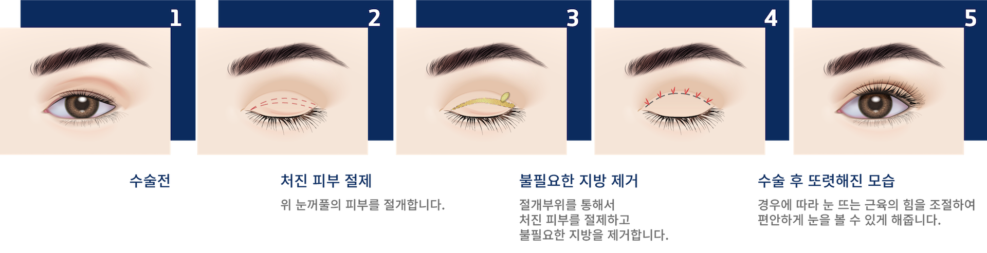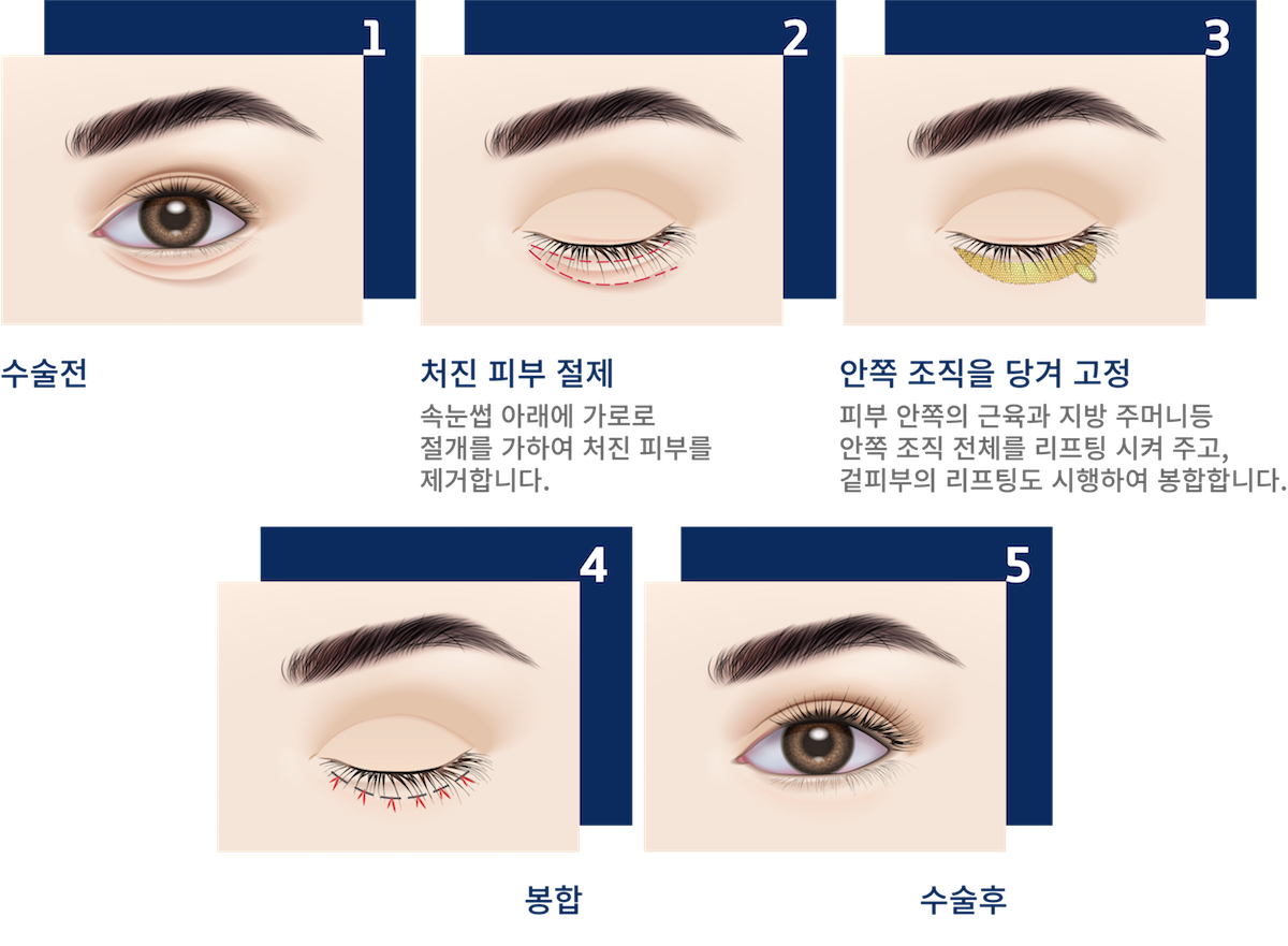 상안검 수술은 이러한 처진 눈꺼풀의 피부와 조직을 제거하여 노화 이전의 상태로 돌려주는 수술입니다.