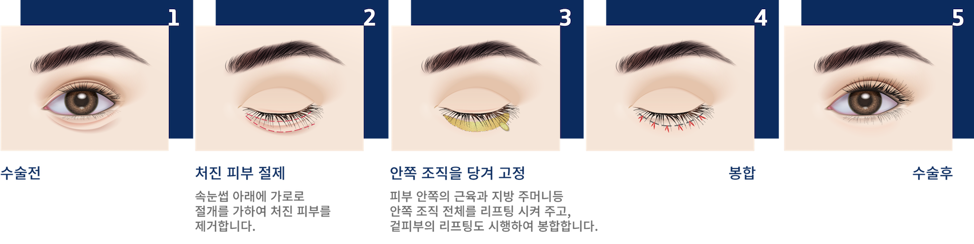 일반적으로 아래 눈꺼풀은 위 눈꺼풀보다 노화 현상이 빨리 나타납니다.